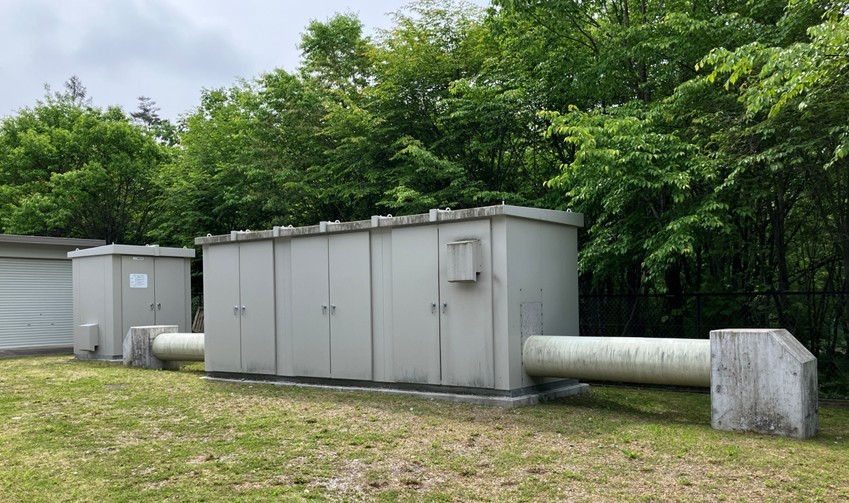発電開始から4年が経過しました。上田子配水池の現在のようすです。配水タンクの手前屋外にシステム制御盤が設置されています。