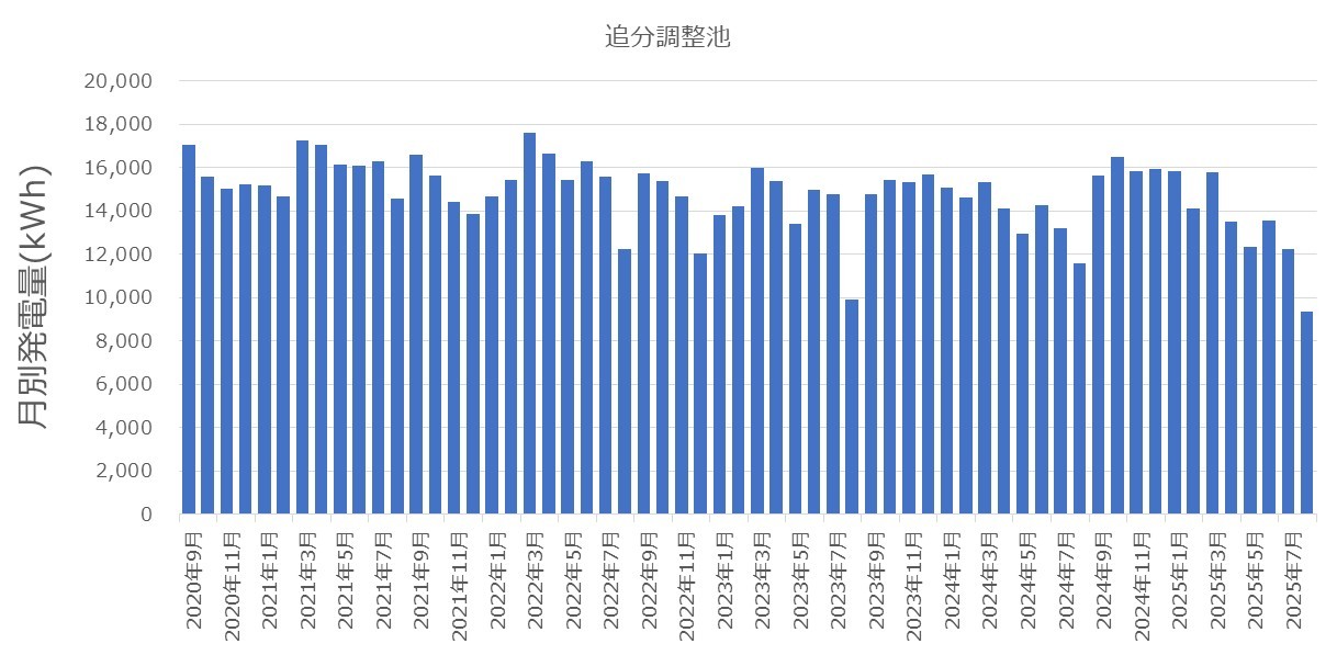 追分調整池マイクロ水力発電所の月別発電量推移です。