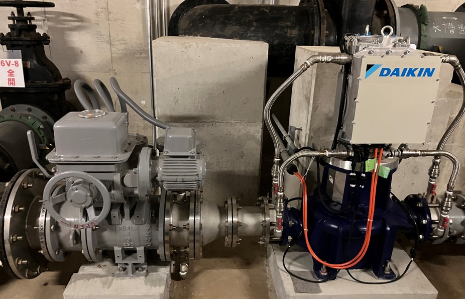 八尾市高安受水場マイクロ水力発電所は、上流の浄水場から高安受水場に接続する管路において受水圧力から生じる「余剰エネルギー」を活用し、マイクロ水力発電事業を行っております。当社発電機を4台並列で運転しています。