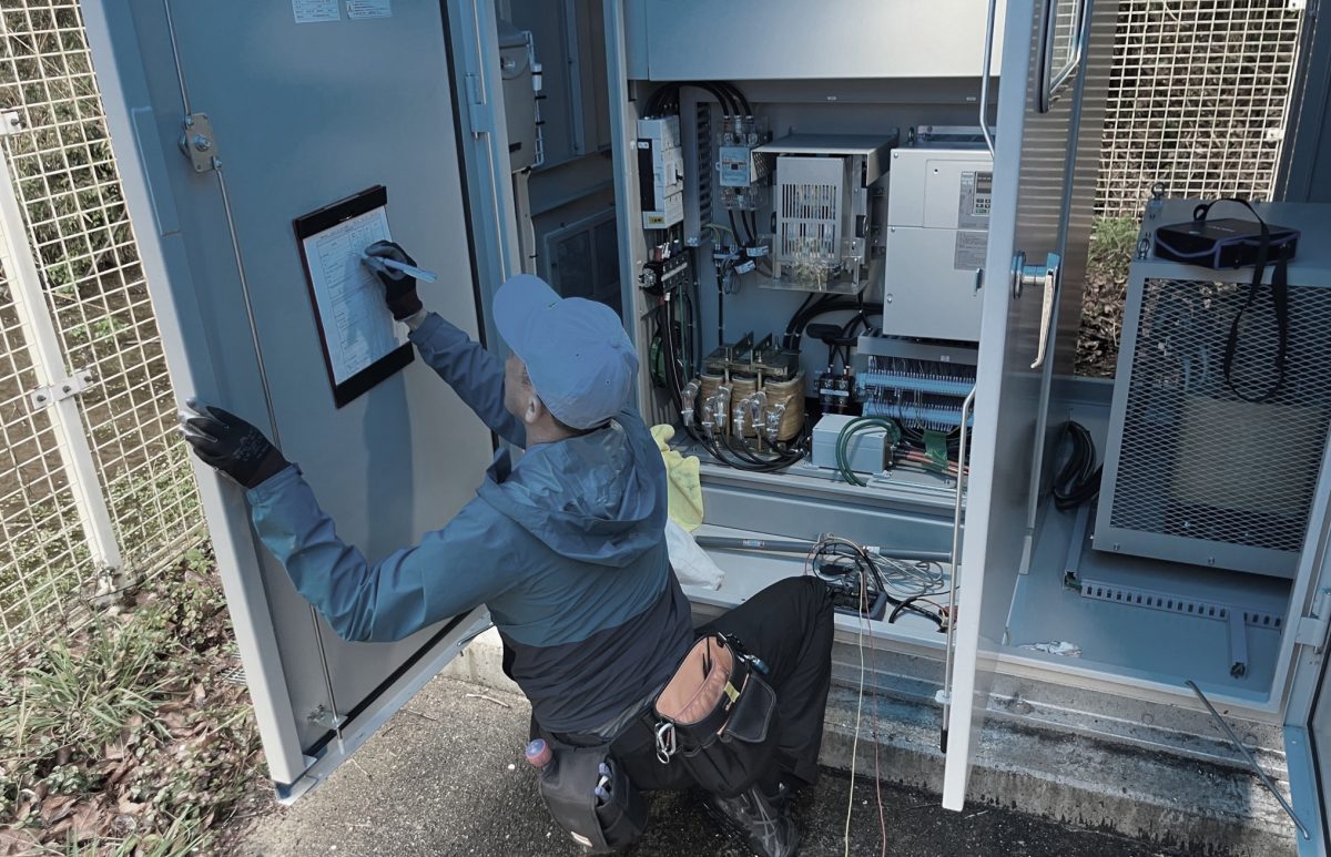 安定稼働を維持するため、定期的な維持管理を行っています。システム制御盤は屋外に設置されており、精密な機器の点検を継続しています。