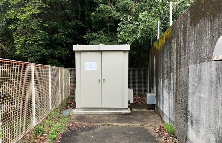 発電開始から2年経過したかずさ水道第四接合井マイクロ水力発電所です。システム制御盤は屋外に設置されています。