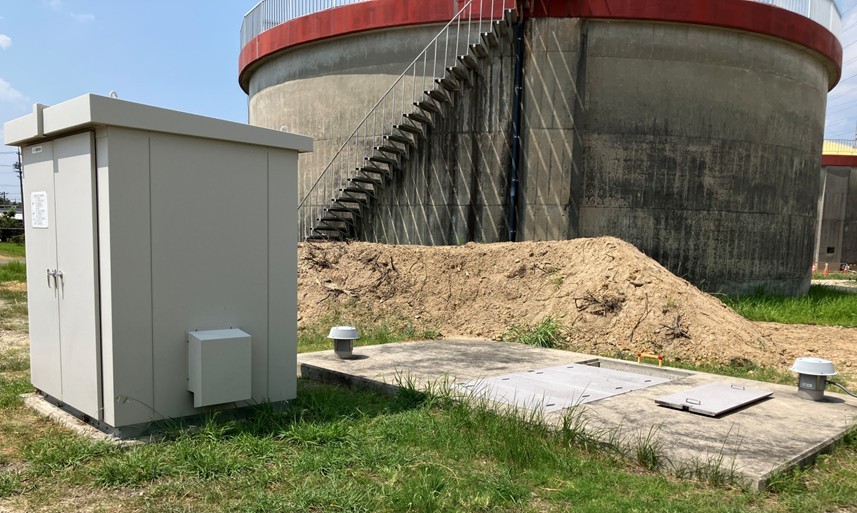 発電開始から4年が経過しました。上田子配水池の現在のようすです。配水タンクの手前屋外にシステム制御盤が設置されています。