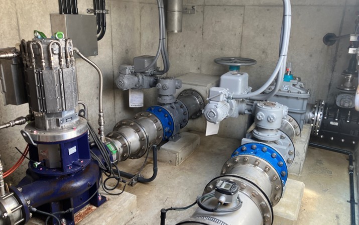 野畑配水場内の配水池手前の既設流量調整弁をバイパスする形で、当社の22kWクラス発電機を2台並列設置しています。